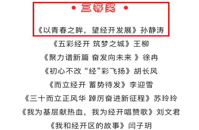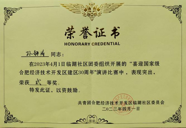 为充分展示经开区新时代青少年的良好精神面貌,进一步激发青春力量立足新起点、开启新征程,合肥经开区党政办、团工委联合举办了经开区30周年演讲比赛我校学子孙静涛荣获三等奖。