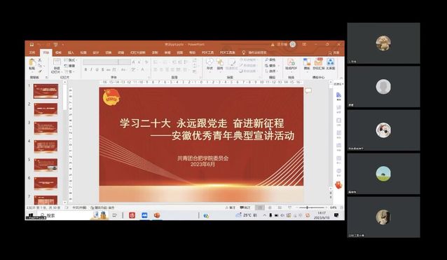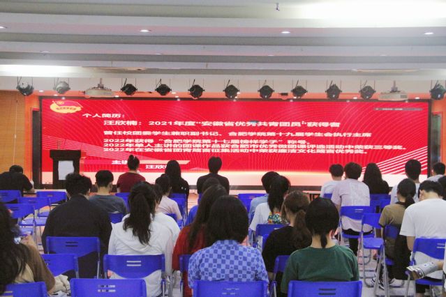 为充分发挥青年典型模范带头作用,进一步营造学习党的二十大精神的浓厚氛围6月17日、18日,我校举行“学习二十大 永远跟党走 奋进新征程”——安徽优秀青年典型宣讲活动。本次宣讲线上线下相结合的模式,分两次开展,2021年度安徽省优秀共青团员汪欣楠担任主讲人。共计290名学生到现场观看,2400余名学生进行网络收看,活动覆盖103个团支部。