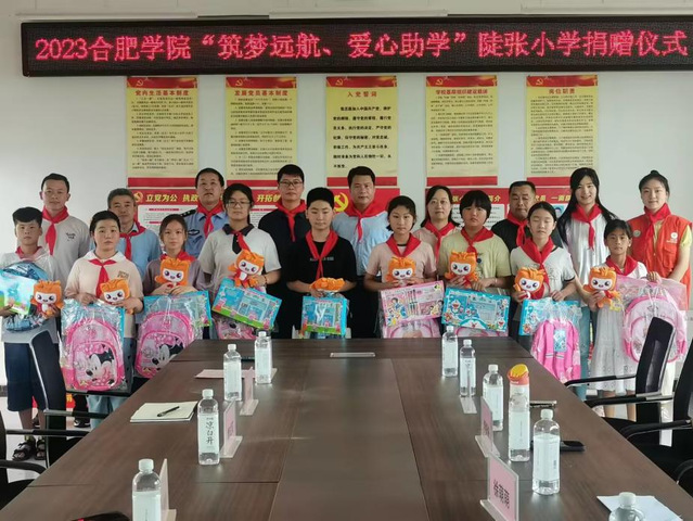 为助力乡村教育振兴,巩固拓展脱贫攻坚成果,7月7日,我校赴泗县陡张村和惠庙村开展2023年“筑梦远航 爱心助学”捐赠活动。我校党委组织部正处级组织员周全、外国语学院党委书记吴孔宝、团委副书记李妍妍、党委组织部副处级组织员张海卿等领导和当地乡镇领导、小学领导出席捐赠仪式,当地小学生代表和我校学生志愿者代表参与仪式。仪式分别在陡张小学和惠庙小学举行。