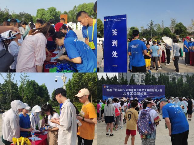 2023年8月19日上午,首届“北斗杯”安徽省青少年空天科技创新大赛——北斗定位闯关赛在合肥市经开区南艳湖公园顺利举行。来自合肥学院的30名青年志愿者们穿戴整齐,协助工作人员组织人员进行签到,同时引导家长和孩子们有序入场。
