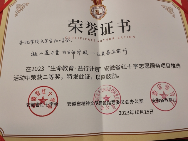 10月13日至15日,由安徽省红十字会、省文明办、省教育厅、省民政办主办的2023年“生命教育·益行计划”红十字志愿服务项目推选活动决赛路演在合肥圆满落幕,我校大学生红十字会参选项目“凝人道力量,为生命护航——让爱益直前行”荣获二等奖。
