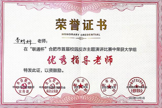 12月1日,合肥市首届校园反诈主题演讲比赛决赛在安徽城市管理职业学院圆满落幕。我校语言文化与传媒学院学生徐萌萌荣获三等奖,教师李妍妍荣获优秀指导教师奖。
