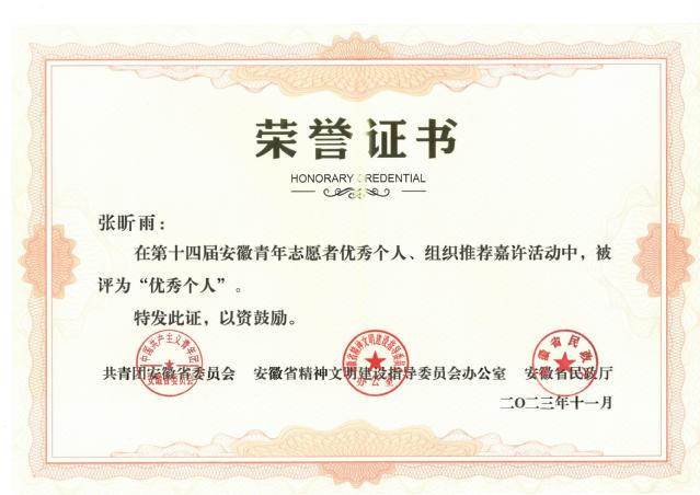 张昕雨,经济与管理学院20级经济学专业学生,中共党员,品学兼优,热衷参加和组织志愿服务活动,曾任校团委学生兼职副书记、校青志联主席团成员。学习成绩优秀,获国家励志奖学金、一等奖学金。积极参加各类学科和技能竞赛,曾获第八届中国国际“互联网+”大学生创新创业大赛安徽省金奖、国家级铜奖等。多次获评校级三好学生、优秀学生干部、优秀共青团员、优秀志愿者、三下乡先进个人等荣誉称号。积极参加共建文明校园、暑期三下乡、安徽省脱贫攻坚第三方评估等志愿服务活动,担任2022年国家网络安全宣传周、2022年世界集成电路大会、2023年中国航天日等大型赛会服务的组织负责人,累计志愿时长达500小时。