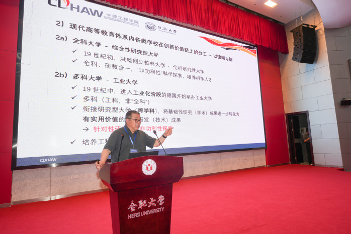 同济大学中德工程学院院长冯晓作题为《科教融汇、产教融合,构建高校研教用相长、互动创新的内生机制》的报告。