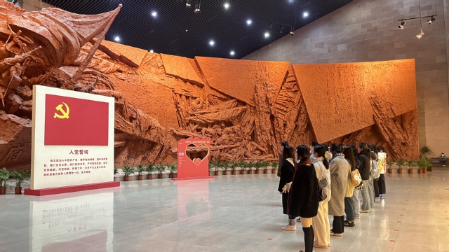 纪念馆内,支部书记带领全体党员面向鲜红党旗宣读了入党誓词。大家举起右拳,一字一句地宣读誓词,声音坚定有力,新发展党员也通过宣誓进一步了解党员责任和使命。