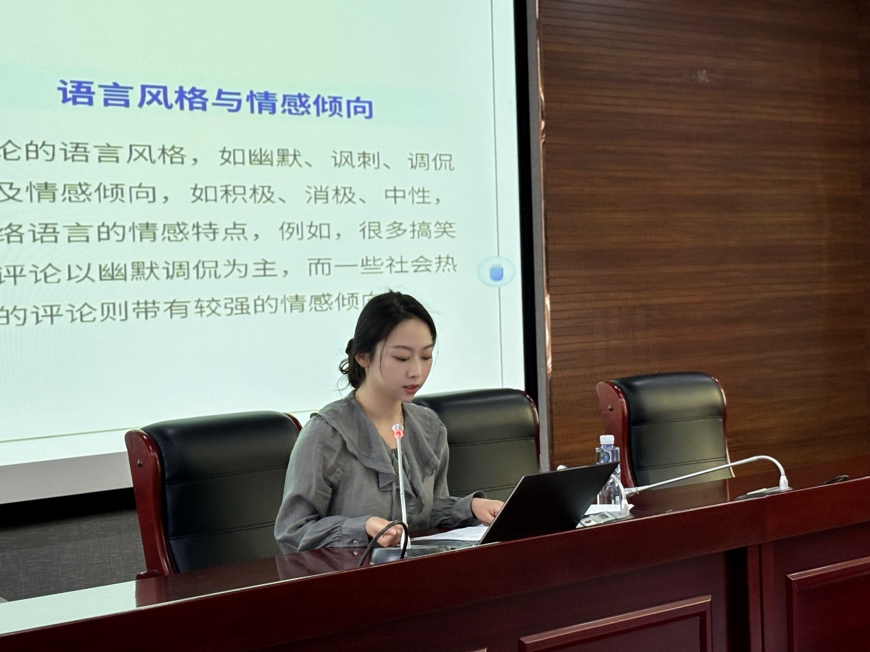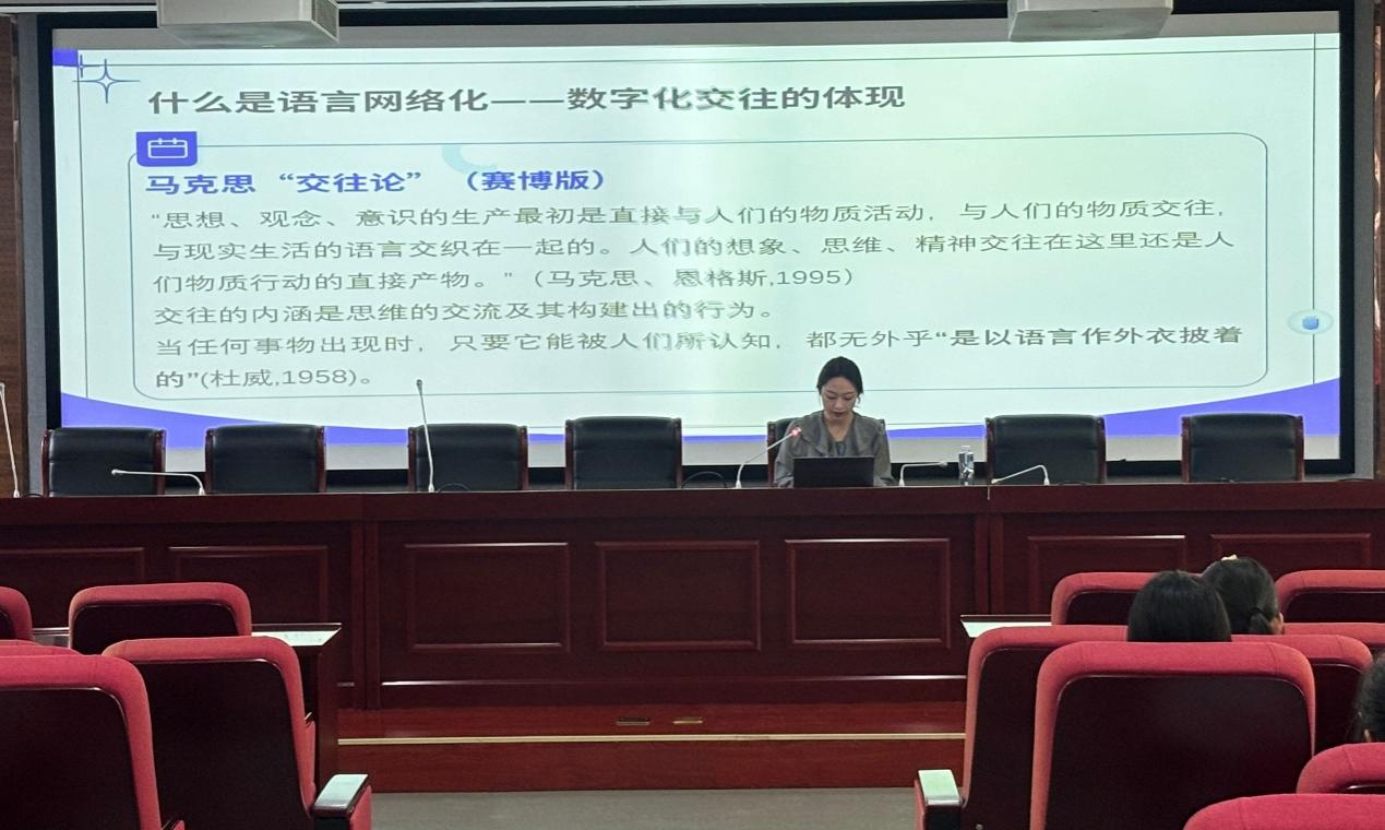 赵天琪以“语言网络化”为切入点,结合李普曼的“拟态环境”理论和马克思的“交往论”,剖析了数字化交往对语言生态的重构。她在讲座中谈到,网络语言不仅是交流工具的革新,更是思维方式的变革。从传统的逻辑性表达转向碎片化、娱乐化的“语言通胀”,例如“哈哈哈哈”式的情感宣泄、网络热梗的泛滥使用,以及表情包对文字表达的替代。这种现象背后,折射出媒介技术对人类思维的深层规训。