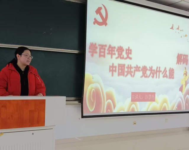 彭慧艳老师围绕百年党史,以“中国共产党为什么能”这一主题进行发言。她从中国共产党的丰功伟绩出发,讲述中国共产党在马克思主义的带领下茁壮成长,最终建立新中国的辉煌历史,论述了马克思主义对中国共产党的重要意义。