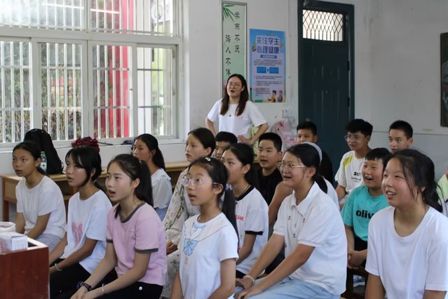 为帮助学生掌握歌曲旋律,教学组采用分段教唱的方式。从舒缓的前奏旋律入手,逐句教唱歌词,同时借助手势引导学生感受节奏变化,“这里旋律上扬,大家可以轻轻抬手”“低音部分要唱得轻柔,像托着玉盘一样”。遇到较难的音阶和发音,成员们反复示范,耐心纠正,确保每个学生都能跟上节奏。