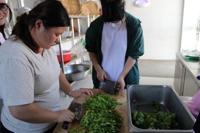 7月5日早上,后勤组成员早早便忙碌起来。他们穿梭于厨房,分工明确、有条不紊地进行食材处理。挑选新鲜青椒与猪肉,将青椒洗净切丝,猪肉切片腌制;同时准备鲜嫩黄瓜,清洗、拍碎、切段,为烹饪做好充分准备。