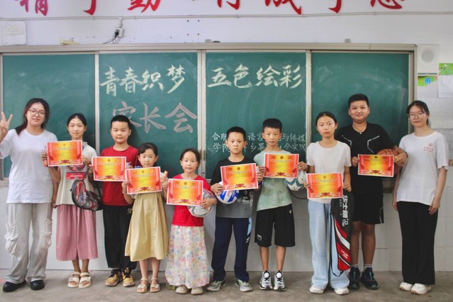 最后,镜头定格了这份珍贵的回忆。全体教学组成员、参与实践的孩子们以及到场的家长们齐聚一堂,留下了情意满满的大合影。镜头前真挚的笑容,是这段难忘旅程最温暖的句点,凝聚了家校社协同育人的力量,也见证了青年大学生服务乡村教育的赤诚之心。