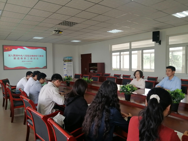 5月6日,旅游与会展学院召开深入贯彻中央八项规定精神学习教育新进教职工座谈会。学院党委书记黄雄英,党委副书记孙静宇出席。学院近两年新进教职工参加会议,孙静宇主持会议。