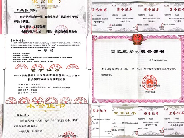 朱灿韵始终将学业作为立身之本。她连续两年斩获“国家奖学金”、校级“特等奖学金”,并获评“三好学生”“优秀学生干部”“优秀团员”等荣誉称号。她积极参与学科竞赛,在第十六届全国高校商业精英挑战赛中带领团队以“未来概念+糖酒会”的创新方案荣获国家一等奖,为合肥市会展业发展注入科技活力。此外,她在“互联网+”大学生创新创业大赛中三度获奖,项目涵盖徽州木雕盲盒、农旅融合、智慧旅游平台等方向,以创新思维助力乡村振兴与行业发展。