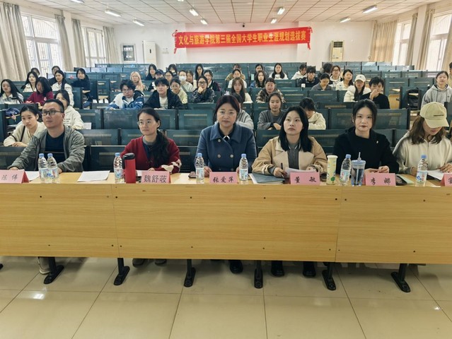 1110日中午1200,文化与旅游学院“大学生职业规划大赛院级选拔赛”在一区善思楼C101教室顺利举行。比赛由学院党委副书记张爱萍、就业工作负责老师陈伟、辅导员魏舒荍、李娜、董敏和窦思佳等人组成评委团,教育学院主持队孙方怡同学担任主持。