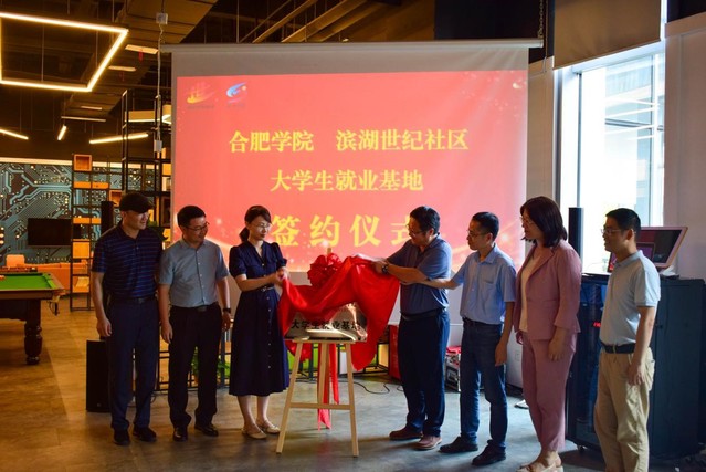 最后,合肥学院宣传统战部部长贾峰与包河区团区委书记吴晓雯共同为“大学生就业基地”揭牌。语言文化与传媒学院党委副书记张爱萍代表我院与滨湖世纪社区党委副书记倪伟共同签订了“就业实习基地”协议。