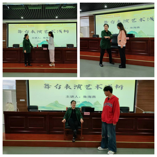 朱海燕院长艺德高尚、艺术精湛,曾获中国话剧最高奖——“演员金狮奖”“导演金狮奖”,被安徽省人民政府授予“安徽省先进工作者”、安徽省“十佳文艺工作者”等荣誉称号。讲座中她以自身经历为切入点,结合曾出演的作品,用精彩的语言和生动的示范,向同学们阐释了话剧表演中如何做好角色处理、情绪掌控和语言的表达。朱院长还采用沉浸式体验的方式和同学们互动表演,使同学们现场体验到话剧舞台表演的独特魅力。