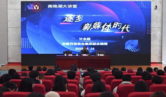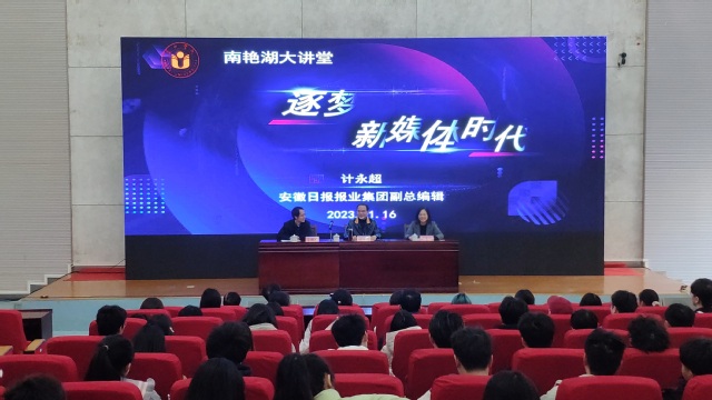 1116日下午三点,由合肥学院科研处、语言文化与传媒学院主办的南艳湖大讲堂学术报告在图书馆报告厅B厅顺利举行。本次活动邀请了安徽日报报业集团副总编辑计永超做题为“逐梦新媒体时代”的学术讲座。讲座由语言文化与传媒学院院长丁增武教授主持,合肥学院校长吴春梅教授致欢迎辞。语言文化与传媒学院党委书记储昭辉,副书记张爱萍,副院长殷明明、查金萍以及150余位新闻传播学专业师生共同参与此次讲座。