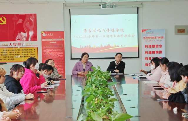 语言文化与传媒学院深入落实立德树人根本任务,围绕培养目标,坚定育人中心,努力提升人才培养能力。学院于近期召开了2023-2024学年第一学期师生教学座谈会,学院党委副书记张爱萍、教学院长殷明明、学工办主任顾盼盼、教学办主任章衡和各班学生代表与会座谈交流。