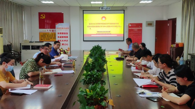 7月10日下午,语言文化与传媒学院在学院大会议室举行党纪学习教育读书班结班式暨党委理论学习中心组集中学习研讨会,学院领导班子成员、党委委员、纪委委员、科级干部及各党支部书记、系(中心)主任参加会议,会议由院党委书记储昭辉主持。