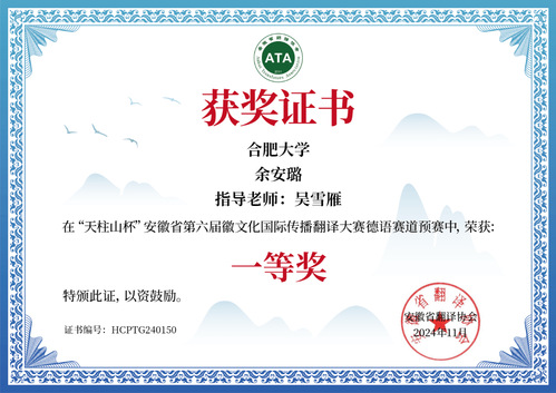 近日,“天柱山杯”第六届徽文化国际传播翻译大赛预赛成功举行。外国语学院德语专业53位同学参加,获一等奖1名、二等奖6名、三等奖15名、优秀奖17名。其中余安璐同学将代表日韩欧美福利视频_黑人巨大人精品欧美三区_欧美成人另类人妖_欧美在线精品一区二区三区_欧美一区二区三区性视频_日韩精品欧美视频_性欧美极品xxxx欧美一区二区参加“天柱山杯”第六届徽文化国际传播翻译大赛德语赛道决赛,与其他优秀选手同台竞技。