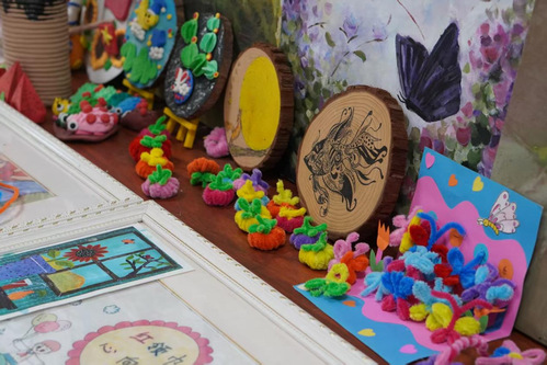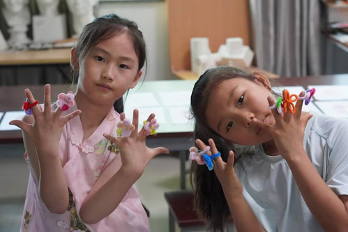 活动现场,志愿者小老师和孩子们围坐在一起。在制作扭扭棒作品时,小老师们手把手指导,从扭扭棒的弯折塑形到色彩搭配,一步步带领孩子学习与探索。孩子们手中的扭扭棒像被施了魔法,一只只灵动的花朵戒指、一朵朵别致的花朵手环渐渐成型。现场气氛热烈。专注的神情、尝试新造型时的兴奋,让课堂满是童真与活力,在乡村夏日绘出创意满满的画面。