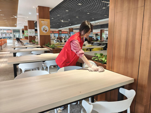 本次活动具体分为两个项目。活动一是食堂秩序维护。志愿者们分工协作,认真清理食堂各个角落,不仅处理餐桌上残留食物,还清理地面油渍与垃圾,让食堂环境更整洁舒适。活动二是规范停车。志愿者们各司其职、紧密配合,热情引导学生规范停车,对停放不规范车辆耐心摆放整齐,使食堂门口停车场景变得井然有序、道路通畅。