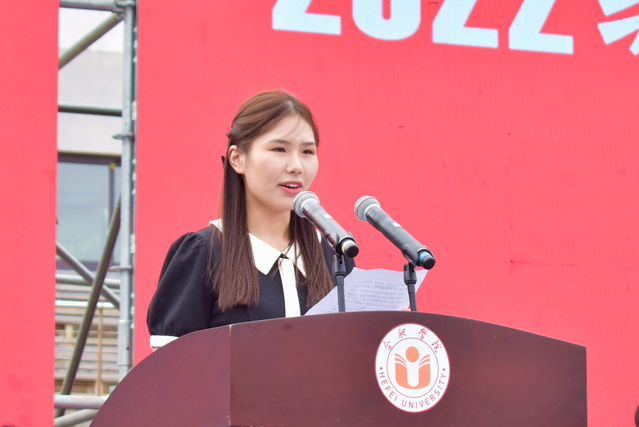 外国语学院19英语1班郭兆薇同学作为老生代表上台发言,她讲述了参军入伍给自己带来的成长改变,希望学弟学妹们珍惜时光,在大学校园里努力学习和历练,做一个对社会有益的人。同时她表示,要感谢父母的支持、学校和老师提供的平台和机会,让她得以成为更好的自己。