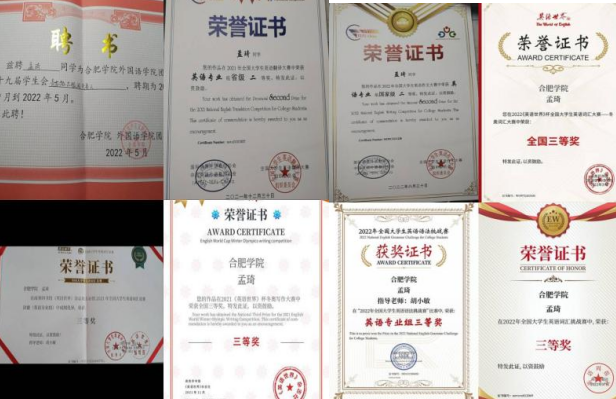 每一项成绩都是用时间与经历描绘出的画卷,一笔一画,点点滴滴,每一步都尤为不易,但是,坚持才能创造奇迹,拼搏就能书写未来!莹莹星火,光艳四射。孟琦集点滴以汇江流,用坚持不懈的努力和拼搏进取的精神树立了新的标杆,国家励志奖学金、2021“批改网杯”全国大学生英语写作大赛优胜奖决赛全国一等奖、2022全国大学生英语作文大赛国家级二等奖等等都是孟琦在不断拼搏下取得的不菲成就,值得敬佩与学习。