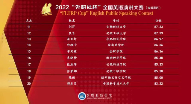 10月29日,2022“外研社·国才杯”全国英语演讲、写作、阅读大赛安徽省级决赛开启,外国语学院选派的孟琦、申笑慈同学在决赛中与来自全省各高校的选手同台竞技,稳定发挥,表现优异。孟琦同学分别参加了写作和阅读决赛,最终取得写作一等奖、阅读二等奖的好成绩;申笑慈同学获得演讲二等奖。孟琦同学以全省排名第一的成绩顺利晋级写作大赛全国决赛,这也是近年来我院在此项赛事上的一项重大突破。