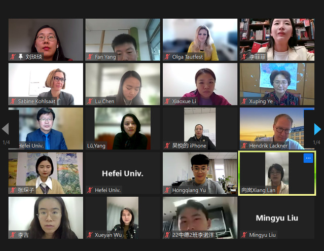 10月27日下午,经管学院通过远程视频的方式召开线上中德双方教学团队与2022级中德物流专业新生见面会。线上会议由物流管理系副主任、中德物流教研室主任、项目负责人殷辉教授主持,德国奥斯纳布吕克应用科学大学社会科学学院教学副院长Lackner,外国语学院院长叶旭萍,合肥学院国际处副处长孔春华,经济与管理学院副院长吴悦,德方合作团队,外国语学院2022级中德物流专业德语专业教师刘琰琰、刘铭渝、李菲菲、吴雪雁、张琛子、李吉和中德物流专业大一新生参加见面会。