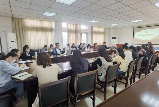 为深入学习宣传贯彻落实党的二十大精神,在全体教师党员中统一思想,凝聚共识,团结奋进,11月8日下午3时,外国语学院于8栋三楼会议室召开全体教师党员大会,院领导班子围绕深入学习宣传贯彻落实党的二十大精神讲授专题党课,会议由院党委副书记吴孔宝主持。