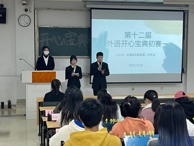 11月22日晚六点四十五分,外国语学院第十二届“开心宝典”初赛第一场在一期五栋101顺利举办,共有八支队伍参加本次比赛。