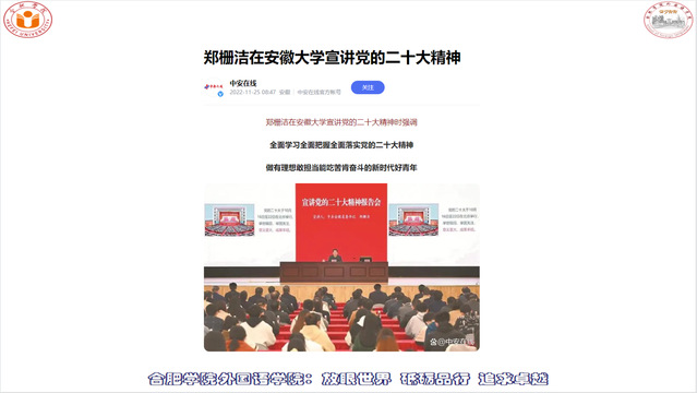 青年强,则国家强。当代中国青年生逢其时,施展才干的舞台无比广阔,实现梦想的前景无比光明。为了让所有学生通过党的二十大精神的学习,认识到自己的光荣使命,努力成长为德智体美劳全面发展的社会主义建设者和接班人,外国语学院通过线上、线下和主题班会等形式,在全体学生中宣讲党的二十大精神