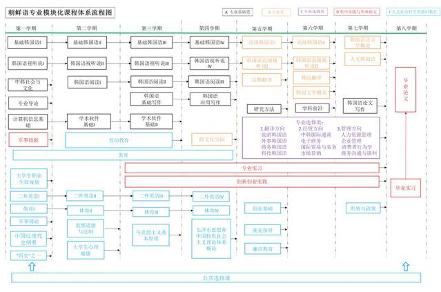 1. 韩语专业技能模块:专业导论(韩)、基础韩语高级韩语韩语视听说韩语阅读基础韩语写作应用韩语写作韩汉互译、托业英语