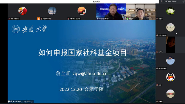 12月20日下午,安徽大学外国语学院院长、国家社科基金项目、教育部人文社科规划基金项目、国家留学基金项目、安徽省哲学社会科学规划项目评审专家詹全旺教授应邀通过腾讯会议,进行了“如何申报国家社科基金项目”的学术报告。此次报告由校科研处和外国语学院主办、校科协协办,是学校“南艳湖大讲堂学术报告”系列之一。