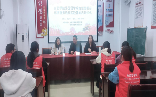 2023年3月22日下午3时,外国语学院与始信居委会共建志愿服务实践基地启动仪式顺利举行。此次启动仪式由合肥市经开区临湖社区始信居委会主办,始信居委会党委副书记方霞、外国语学院党委副书记吴孔宝、团委副书记张正华及始信居委会爱心课堂负责人魏一波参加了启动仪式。