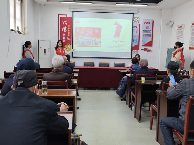到达社区后,志愿者们首先布置会场,做好相应准备工作。而后志愿者结合党的二十大报告,从民生保障、环境保护、政治建设、文化建设等方面进行理论宣讲,以浅显易懂的语言帮助社区居民更好理解党的二十大精神。