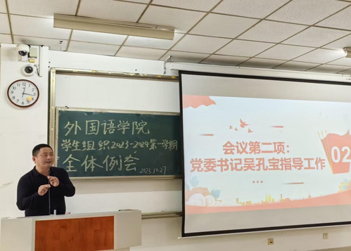 10月27日12时10分,外国语学院学生会于5-101召开了第二十一届学生会第一次全体大会。出席本次大会的有外国语学院党委书记吴孔宝、团委副书记张正华、教师兼职副书记王雨濛及院学生会全体成员。