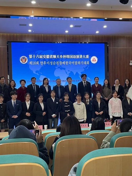 顺天乡杯韩国语演讲比赛是安徽省韩国语学科唯一的全省级赛事,由安徽省教育厅主办,顺天乡大学、合肥学院承办,自2011年起已经举办了16年,吸引了安徽省内10余所高校的韩国语相关专业学生参加。本次比赛也是疫情后的首次线下赛事,合肥学院校长吴春梅、顺天乡大学副校长金瑃淳、安徽省教育厅外事处处长姚德勇在开幕式上先后发言鼓励各校选手积极参赛,努力提升外语能力和国际化水平,服务地方,促进中韩两国友好交流。外国语学院院长叶旭萍顺天乡大学国际交流处处长柳炳旭、主任金仁荣、副主任林丽明莅临比赛现场。