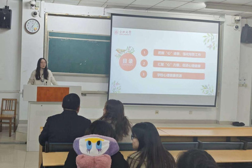 接下来,王雨濛老师就外国语学院心理健康教育工作进行了发言。她介绍了学校及学院的心理健康资源,鼓励同学们积极发挥联络员和学生骨干的作用,关心帮助身边的同学,汇聚“心”力量。她还强调了心理健康对于学生学习和成长的重要性,呼吁大家关注自身心理健康,充实大学校园生活。