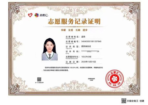 她积极参加志愿活动,志愿时长超100小时。她在任合肥学院外国语学院学生会志服团负责人期间,组织并参与了海恒社区文明创建、共建文明校园和始信社区爱心课堂等志愿活动。在这个过程中她积极服务他人、回馈社会,也提高了自己的组织协作、沟通交流和实践能力,并且在实践中不断发展更新知识,不断充实自我,做到深学深悟,知行合一。
