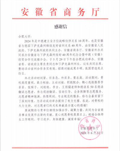 6月12日,安徽省商务厅向外国语学院发来感谢信,以表彰学院在安徽省与下萨克森州结好40周年纪念会暨中德(安徽)经贸合作交流推介会中的支持与贡献。