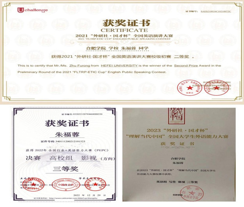 除了专注于考研之路,朱福荣还致力于在比赛中不断成长。在校期间,她还参加过多次比赛,获得过“外研社·国才杯”全国英语演讲大赛校级二等奖、全国行业+英语能力大赛高校组影视方向决赛三等奖以及“外研社·国才杯——理解当代中国”全国大学生外语能力大赛校赛三等奖等等。正是因为不断地参加竞赛,不断从竞赛中获得进步,朱福蓉变得越来越自信,她的专业水平也获得了较大的提升。