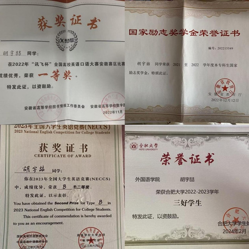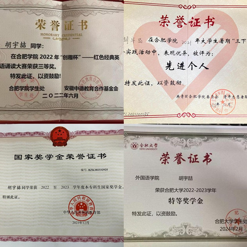 除了刻苦学习书本知识以外,她积极参与各类学术竞赛,开阔眼界、丰富阅历,并凭借扎实的知识储备和敏锐的思维能力,在竞赛中屡创佳绩。曾获得2022年“讯飞杯”全国高校英语口语大赛省级一等奖、大学生英语竞赛B类二等奖等。这些荣誉的背后,是无数个日夜的努力和汗水的积累。此外,她热衷于参加各项文艺活动,荣获2022年合肥学院第十九届校园文化艺术节一等奖。
