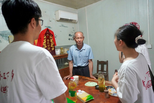 在镇、村干部的带领下,团队师生首先来到老党员吴根发家中,聆听他的红色故事。交谈过程中,成员们得知吴老先生早在70年代就已加入党组织,孙辈在耳濡目染下继承优良传统,成绩优异,家中贴满了各类荣誉。谈及入党心路,吴根发说道:“入党之后,我告诉自己一定要戒骄戒躁,全心全意为人民服务。”