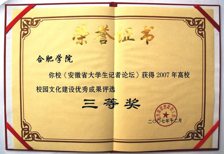 在2007年教育部思政司公布的全国高校校园文化建设优秀成果评选中,“安徽省大学生记者论坛”获得三等奖,充分展示了我省大学生的社会主人翁精神、自主创造性和思想层次性。