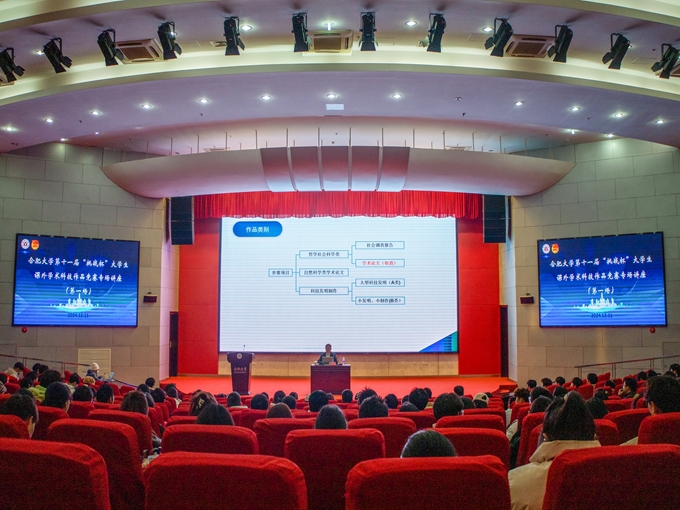 随后开展的是“挑战杯”大学生课外学术科技作品竞赛专场讲座,安徽诚恩文化科技发展有限公司总经理许飞担任主讲嘉宾。许飞细致从赛事分类、参赛作品申报、评审标准等方面进行介绍,引用“田忌赛马”典例深入浅出说明主体赛与专项赛的重要性。在选题逻辑方面,他指出了时间早主题正”的关键,在经验与案例分析中,他围绕往年优秀作品分享自己的见解,提议参赛者依据赛事做好标题明晰和调查报告真实的工作,强化成果运用。讲座最后,师生们积极踊跃提问,许飞一一细致回复和指导
