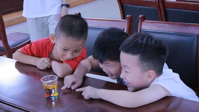 科学探索的种子在肥光社区生根发芽。“有趣的密度”实验课上,学生们看着油杯中滴入的色素如彩虹雨般坠落,在动手实践中理解科学原理。团体心理辅导课程“情绪蛋糕”“原创绘本”更显巧思,通过情景剧形式帮助学生们建立健康心理防线。