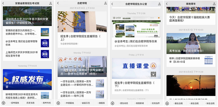 校微信公众号影响力持续提升。招生办与宣传部、校团委、文传学院共建合肥学院招生宣传新媒体工作室,三大微信公众号平台通力合作,在招生宣传季陆续发布学校宣传视频2部及招生政策、招生宣传活动安排和专业简介等系列主题推送40余篇,贯穿学校近三年办学成果,全面直观地介绍了学院专业的师资队伍、学生活动和教学科研成果等内容,为关注学院专业发展和有意报考的考生提供了全方位的信息服务。