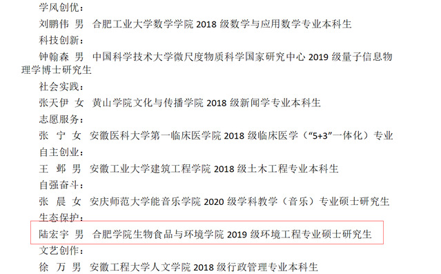 近日,2021年安徽省十佳百优大学生评选结果公示,我校生物食品与环境学院2019级环境工程专业研究生陆宏宇当选安徽省十佳大学生(生态保护类)