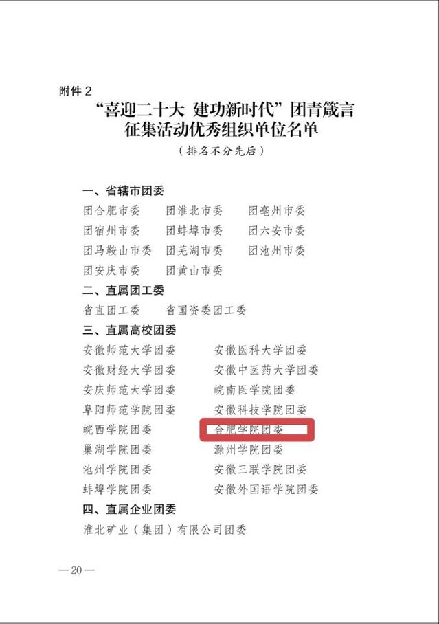 为迎接党的二十大召开,扎实推进从严治团,引领青年奋进新征程,共青团安徽省委举办了“喜迎二十大 建功新时代”团青箴言征集活动。我校学生多件作品在评选中获奖,我校团委荣获“优秀组织单位”称号。